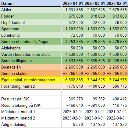 Ärligt talat vet jag inte. Jag har inte uppdaterat utgifterna senaste året, så jag är inte säker på hur mycket vi gör av med, men enligt tidigare år borde det ligga på max 40 000 per månad, vilket är ungefär hälften av våra beskattade inkomster vid full lön. Några andra saker försvårar uträkningen också, även om man anammar 4%-regeln. Alla 10 miljoner är nämligen inte investerade. Jag antar att en renlärig FIRE bara räknar investerade pengar, även om jag tycker att det är helt okej att blanda in övervärde på ett boende, eftersom det är pengar som faktiskt går att använda, antingen genom att flytta till billigare, eller att belåna för att investera (vid en börskrasch till exempel). Men viktigare kanske är att jag inte är en ung FIRE-aspirant, utan bara har 7 år kvar tills jag kan börja ta ut min tjänstepension och IPS.