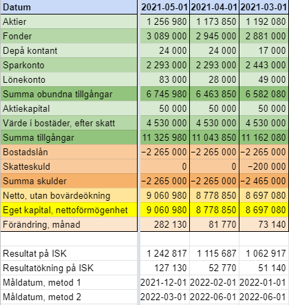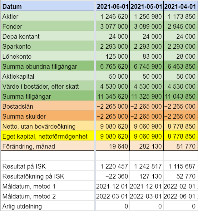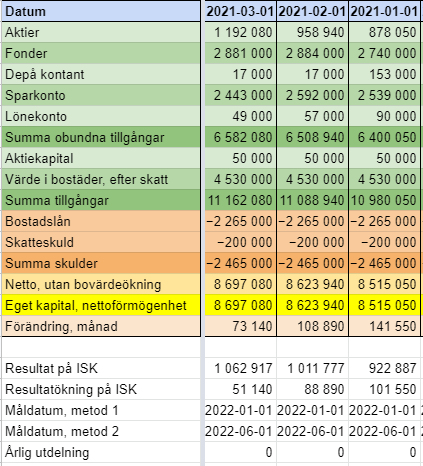 Det riktiga målet är ju egentligen FIRE, men det är ju lite svårt att sätta ett absolut värde på, särskilt när man inte har så långt kvar tills man kan börja ta ut pension (återkommer till det). Istället satte jag ett fluffigt mål på 10 miljoner, bara för att ha något att sikta på som inte rör på sig.