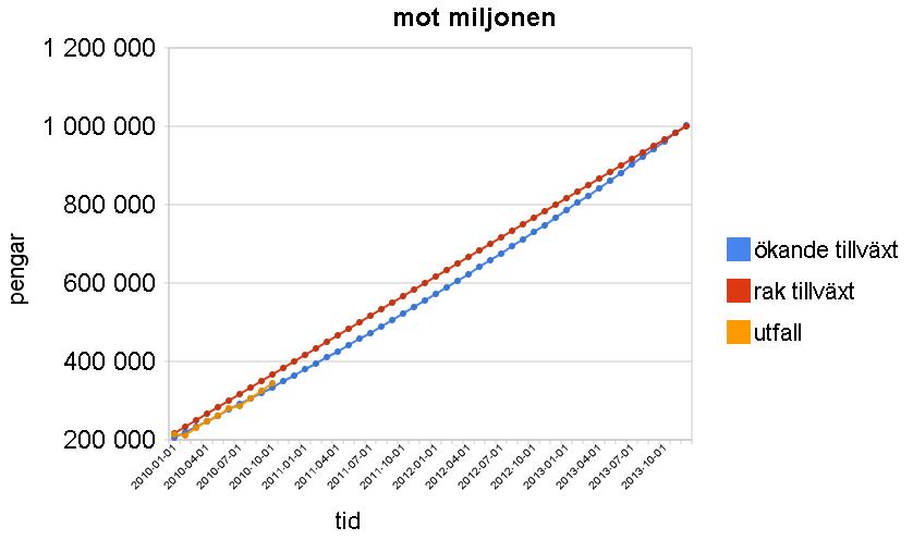 Här är det viktigaste redovisningselementet mot mitt första mål. Denna graf visualiserar målet (1 miljon) och hur jag ligger till mot kurvan jag måste hålla för att nå dit. Jag började med månadsrapporter (för mig själv) för ett år sedan och har därför redan en bit ”utfall” att redovisa. De två andra kurvorna, en rak och en med accelererande ökning, är normkurvor för att visa hur jag ligger till. Den raka kurvan stiger varje månad med snittvärdet jag måste hålla för att nå målet. Den böjda kurvan ger utrymme för att jag ökar överskottet i takt med att kapitalet ökar. Ökningstakten på den kurvan (0,9% per månad) är helt tagen ur luften, för att det skulle passa hyfsat med hur jag ligger just nu. Dessa antaganden kan ju gå fel på många sätt, men det är ändå kul att kolla hur jag ligger till.