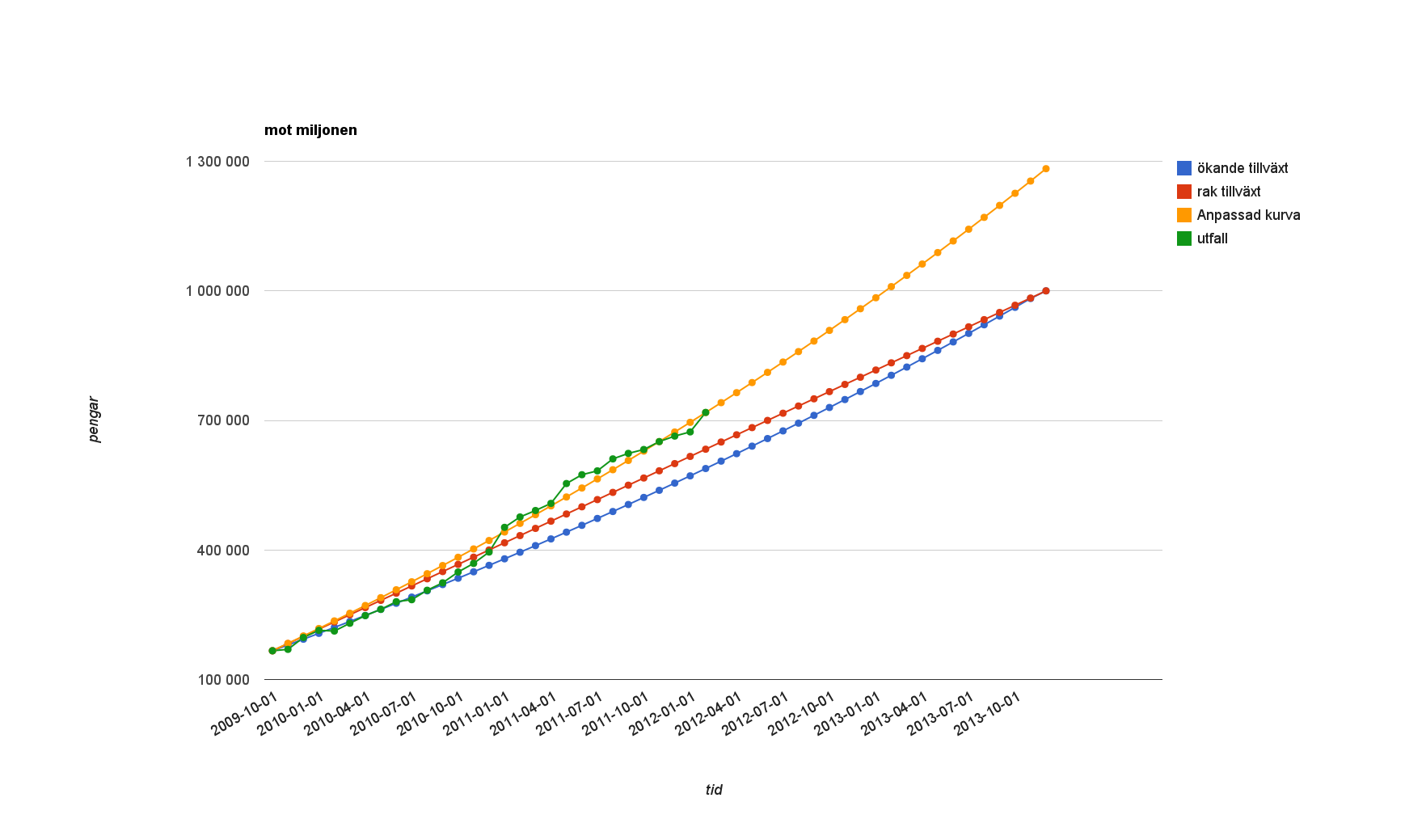 På utvecklingskurvan ligger jag 85 165 före den raka tillväxten och 129 891 före kurvan med exponentiell tillväxttakt. Den anpassade kurvan pekar på att miljonen nås i februari 2013, 10 månader före måldatumet.