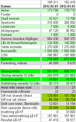 Några tusen upp på aktierna denna månad, plus lite utlägg jag fått tillbaka, plus att jag fått aktier från företaget, ger en bra ökning denna månad. Ränteinkomsterna spädde på med några tusen också. Företagsaktierna ledde dock till lite förmånsbeskattning också som minskade löneinbetalningen.