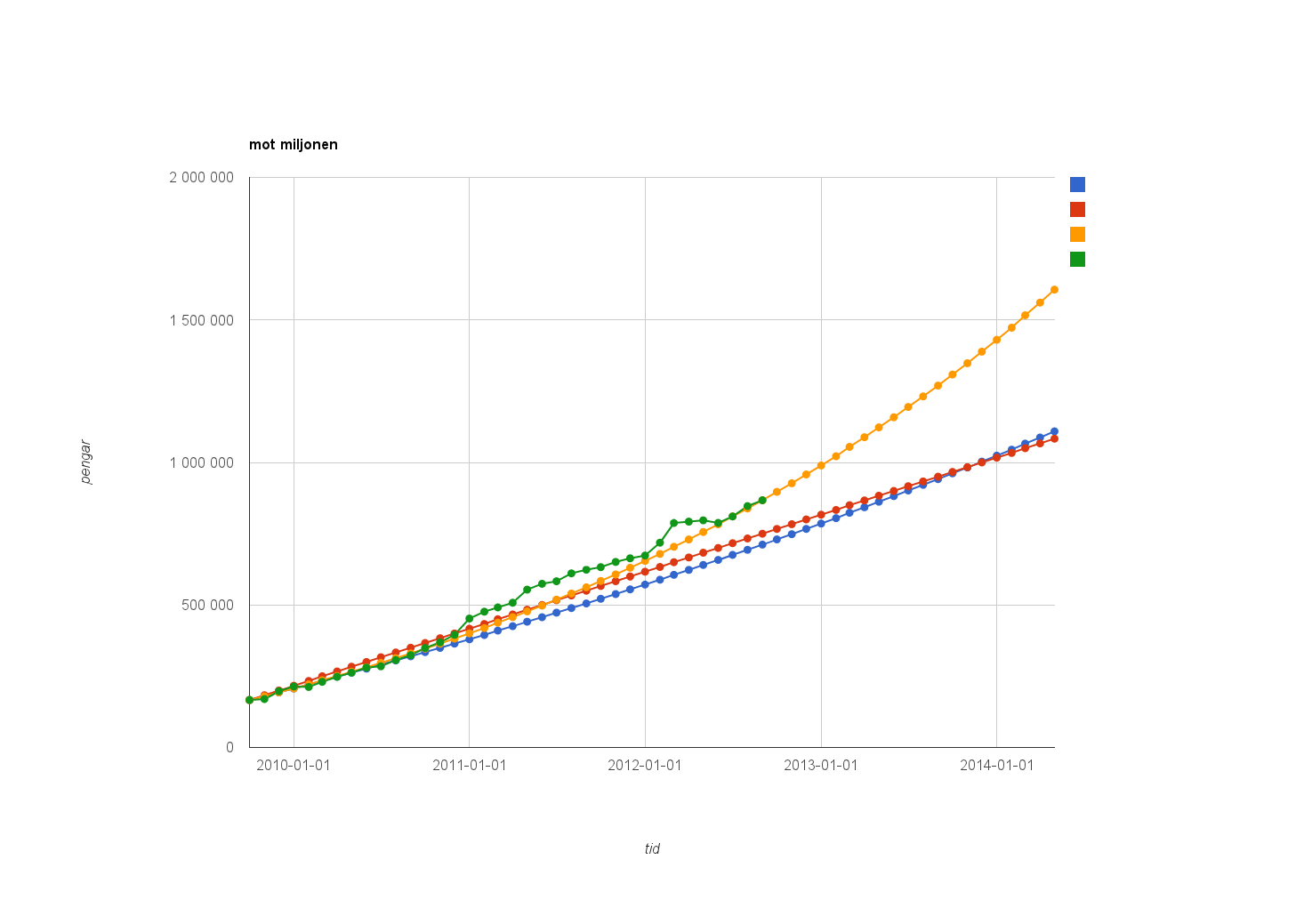 Den anpassade kurvan indikerar nu att miljonen nås först februari 2013, men esset i rockärmen är utdelningen från eget AB, som jag tänkte fixa i december och möjligen kan ha lite inverkan. 6 miljoner ska nås 2018-08-01.