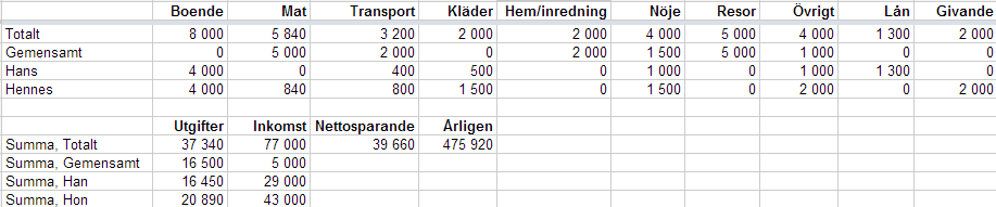 På Resor ligger det hela 5 000, till min frus stora glädje. Men då räknar jag gärna allt på resor när vi reser, alltså även restaurang och andra nöjen. Dessutom behöver vi resa ganska långväga för att hälsa på våra familjer.