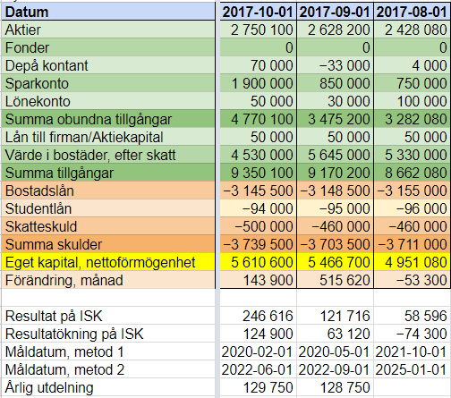 Men sen är är det ju bara ett år sedan vi köpte vårt senaste, och självklart dyraste, boende. Eftersom jag är en sån som räknar in bovärdet i min nettoförmögenhet påverkar det givetvis ganska ordentligt om värdet går upp eller ner med 10% från 4,5 miljoner. 10% är ju det man nästan har kunnat räkna med per år sedan jag flyttade tillbaka till Stockholm 2009.