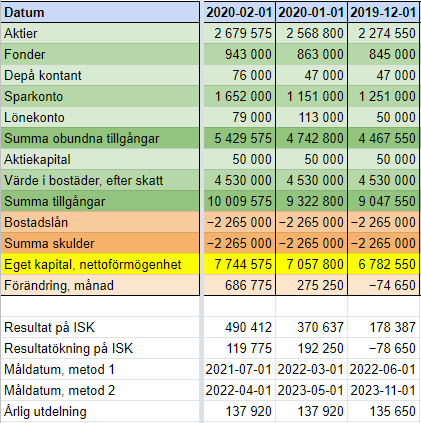 Att se måldatumen krypa så nära känns givetvis bra, men dels har vi som sagt låg inkomst framöver, dels är mitt mål helt taget ur luften en gång för länge sedan. 10 miljoner i total förmögenhet känns väl tilltaget, men egentligen ska jag räkna på 4% avkastning och enbart på det investerade kapitalet, så då är friheten fortfarande långt bort.
