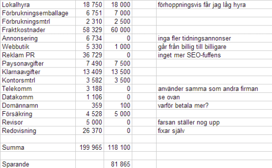 Den vänstra kolumnen är alltså vilka fasta kostnader webbutiken hade förra året. Den högra är mina uppskattade siffror på vad de kommer att vara för 2013.